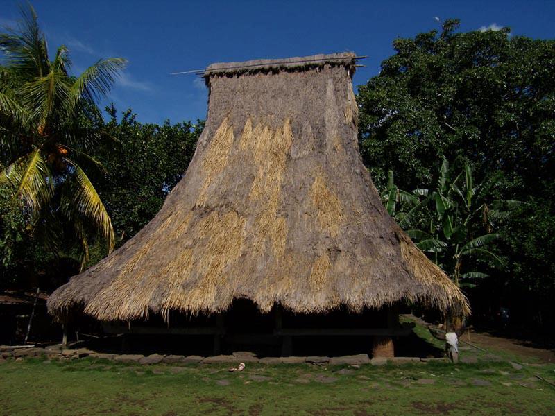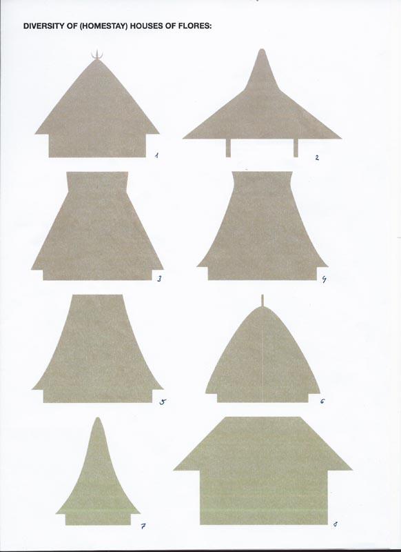 Photos 02B and 02C East-Flores clan-houses around Leworahang. One very distinct feature of the clan houses is the large piece of wood that forms the ridge and is shaped like a crocodile, as well as the three vertical bamboo poles on the roof ridge. Sketch 2B shows the main features of the East Flores dwelling house Sketch 2A shows the outline of the clan house.Photo 03 – it shows a “typical traditional” house of the Nagekeo. You can see that the top of the roof narrows down towards a very short roof ridge, which is then covered with many layers of alang-alang grass – this accounts for the impression that the top of the roof is slanting outwards, just like an upside-down trapezoid (Sketch 3). Also, the houses are built on stilts (three along the front side of the house). The two vertical elements on top of the roof show that the house is of high status (has a special function within the village/clan) – “normal” houses don’t feature these two vertical poles on top of the roof.