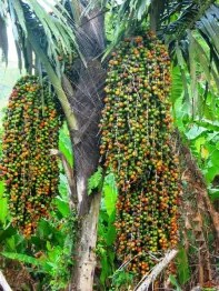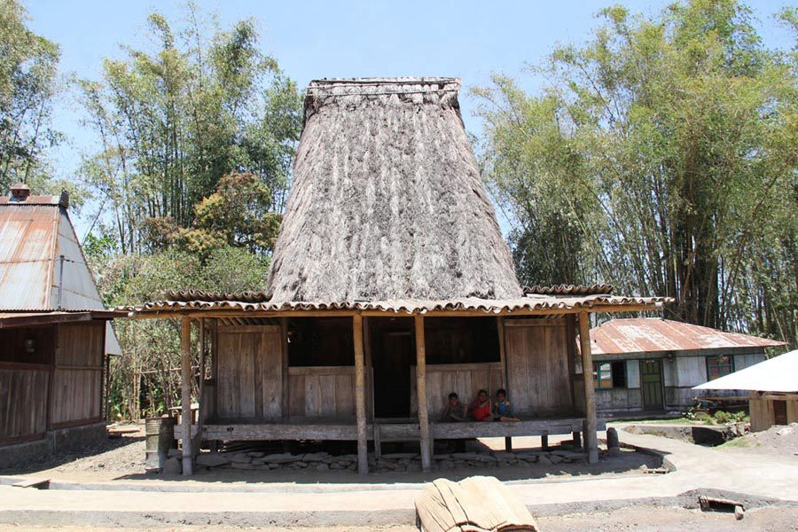 Flores traditional architecture is a separate story by itself. Traversing district borders you immediately notice a difference in the shape of homes and roofs, meaning you have entered a region with yet another culture. Typically all communities have a Rumah Adat, a vernacular house, which is the center of community life, where important meetings are held and ceremonies take place. The Rumah Adat and all houses were constructed with local materials of wood, bamboo, stones and roofs were covered with Ijuk – fibers from the Enau tree – or alternatively with Alang Alang. In this picture of an Enau tree you can see the black Ijuk fibers at the top of the trunk. Alang Alang was harvested from the hills, dried and tied together on bamboo strips. These dry materials burn easily and at times Rumah Adats were destroyed by fires. Nowadays many traditional houses are covered with zinc and many new houses are now constructed with bricks, concrete and plaster.